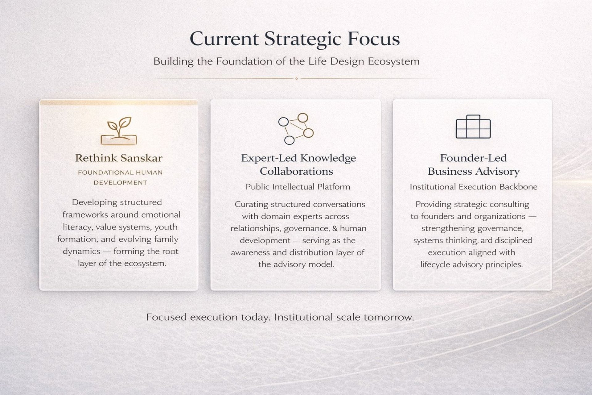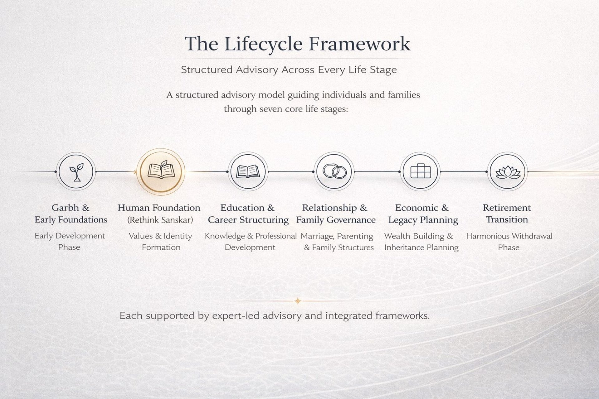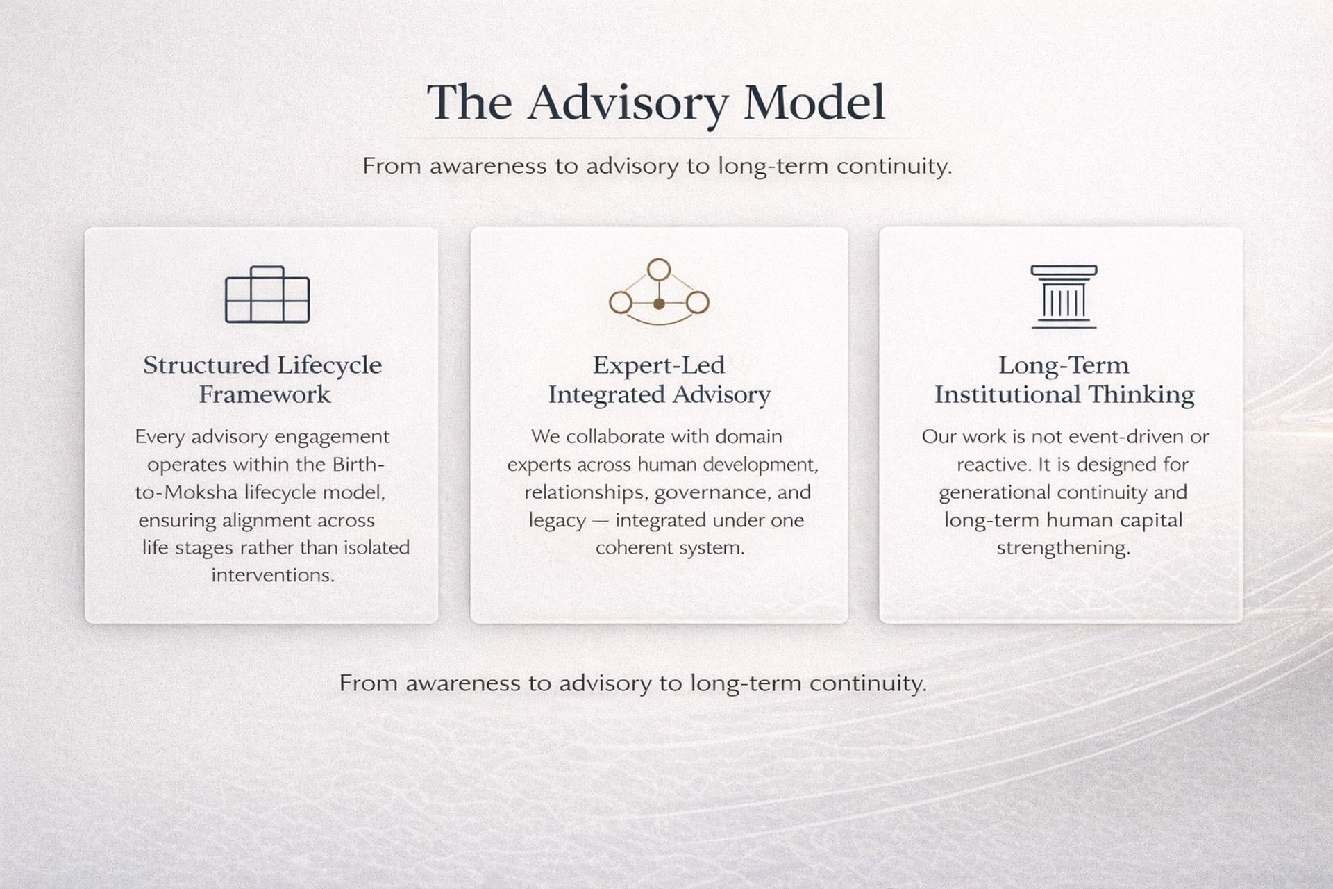 This philosophy informs everything we do — from Sanskar conversations that support everyday living, to advisory and situational guidance offered selectively and with care.