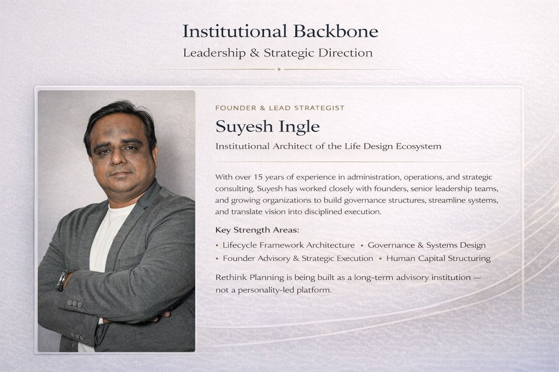 Suyesh Ingle founded Rethink Planning to create credible, expert-led spaces for life decisions that require clarity, dignity, and thoughtful guidance.